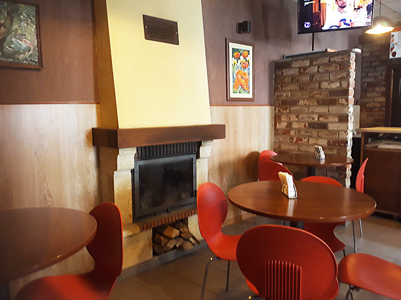 К Вашим услугам: пицца, салаты, десерты, фреш, кофе, напитки, а также уютный зал с камином и TV, прохладная веранда в тени берез.